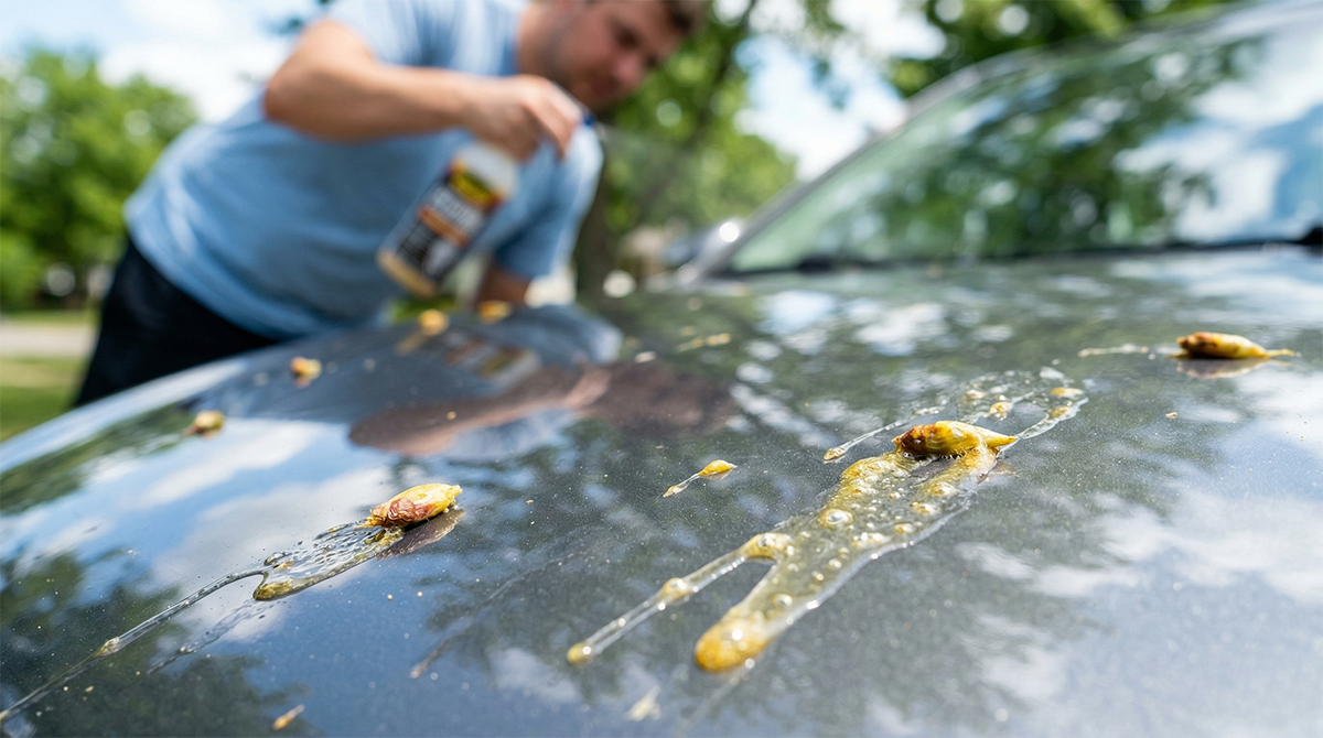 После того как спецсостав размягчил природный клей, категорически нельзя растирать его тряпкой — так вы лишь размажете липкую массу по всему крылу. Требуется мощная сбивка водой под высоким давлением и нанесение правильной активной пены, которая нейтрализует остатки химии.